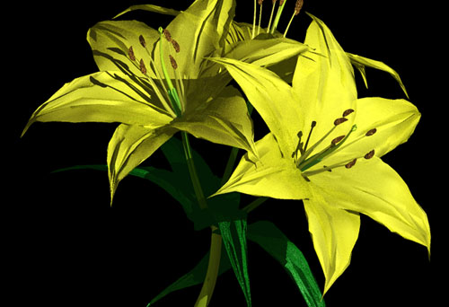 Of course, this one was very pain on neck since this flower has too many petals in very crowded place. Basically, you never use straight output from 3-D program. Here you always have to make some modification on 2-D program since my 3-D program does not have collision detection. You have to render groups of few petals separately, and compose them together with air blush tool on 2-D program. This way, you have very good control of where you want which parts of flower to be.